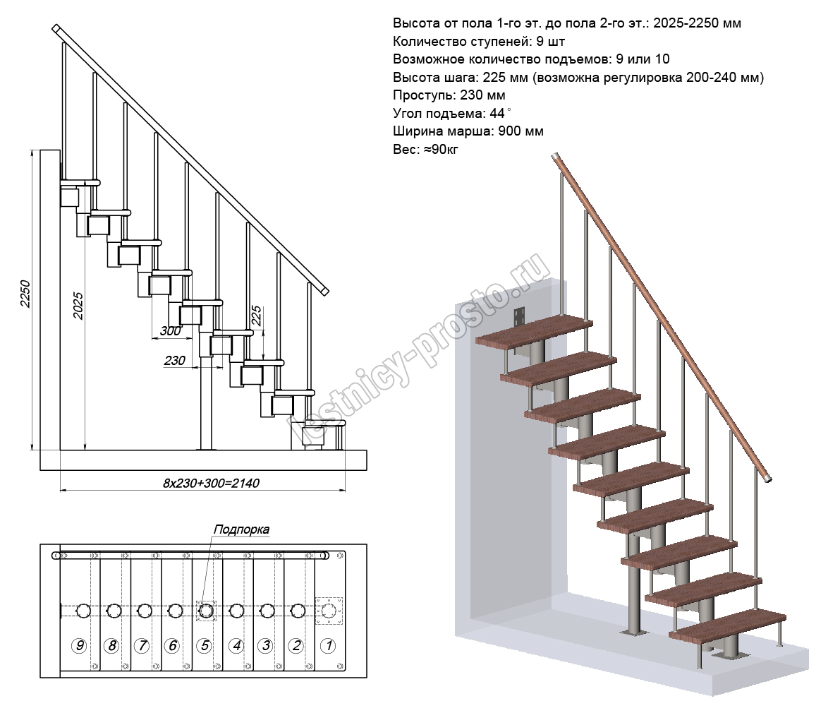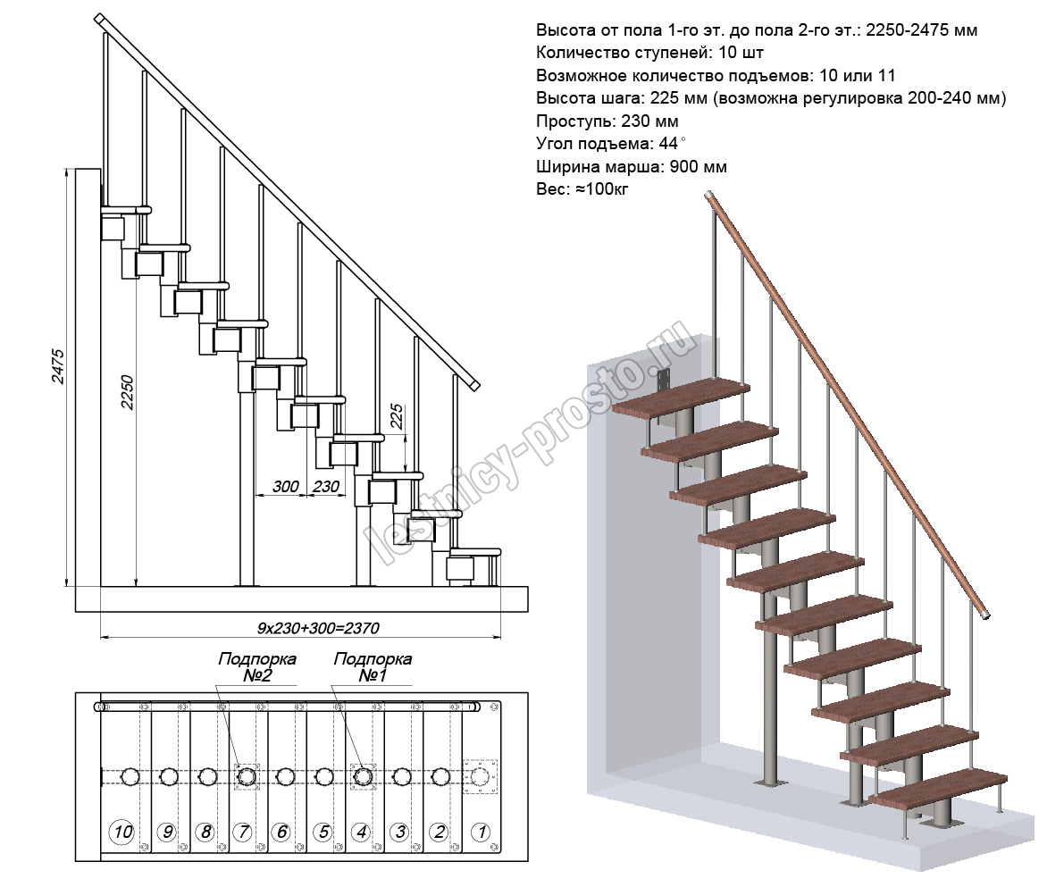 Универсальная, модульная лестница позволяет при сборке регулировать высоту шага в диапазоне  200 - 240 мм.